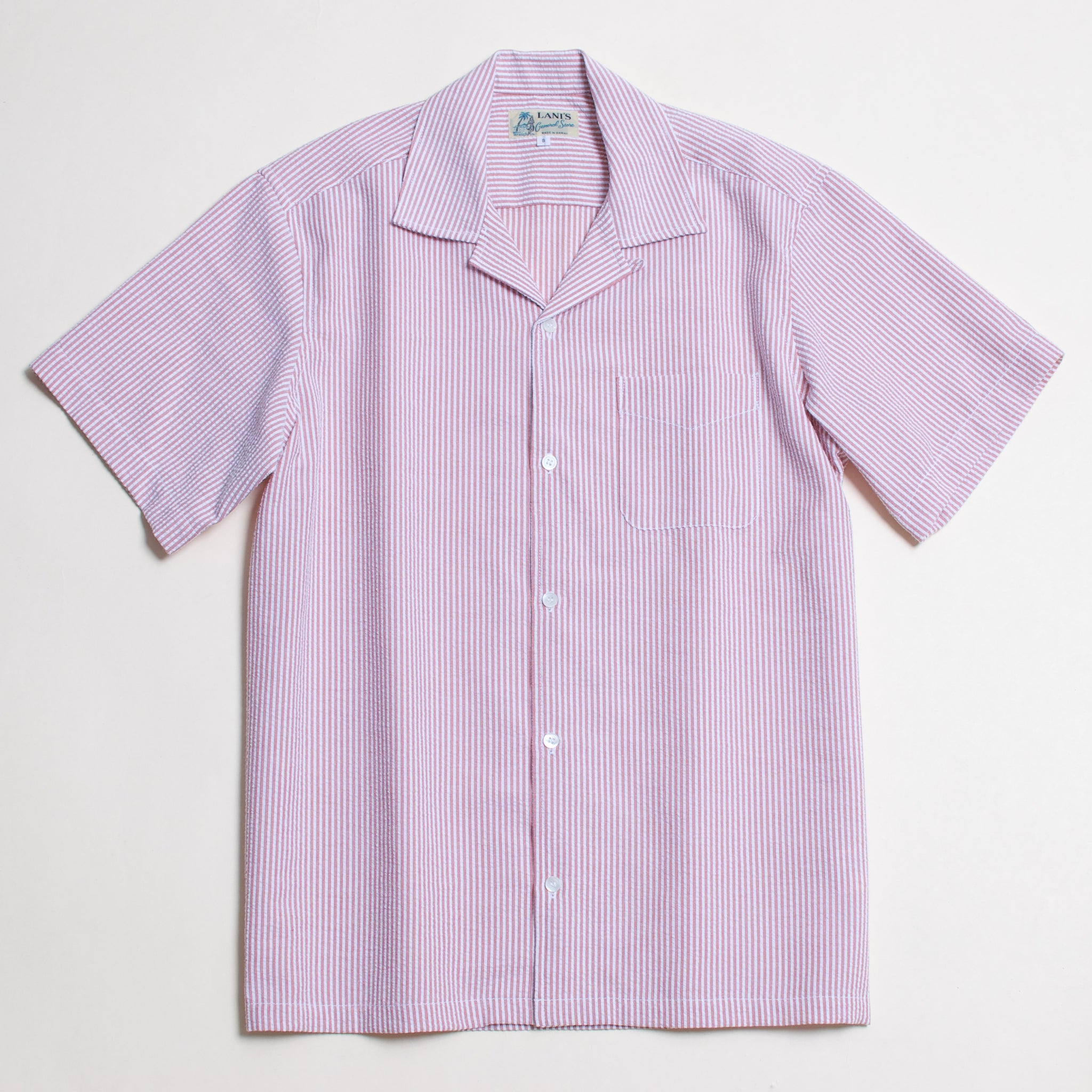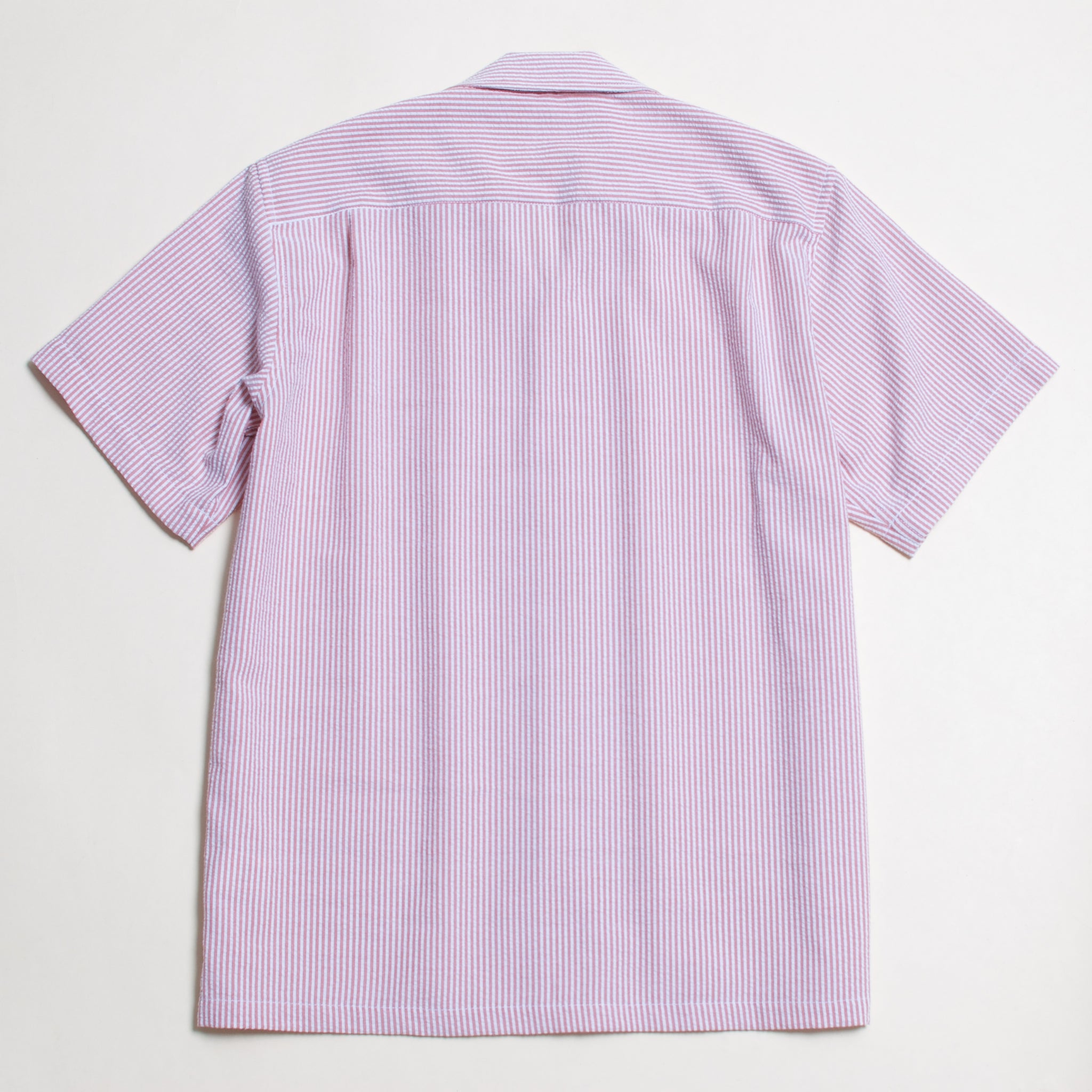 This open-collared shirt is crafted from lightweight seersucker fabric, offering a crisp texture with excellent breathability and comfort.